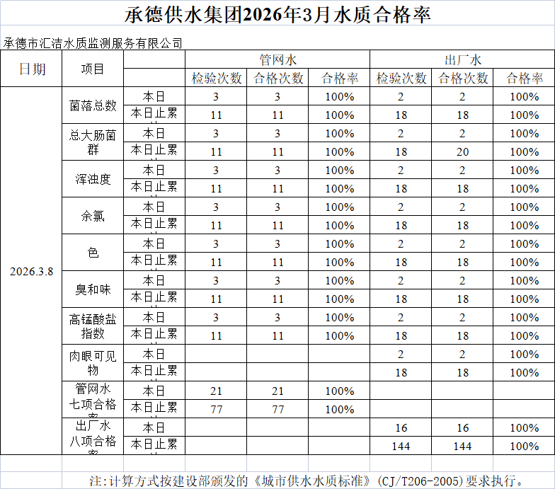 承德供水集團(tuán)2026年3月8日水質(zhì)合格率