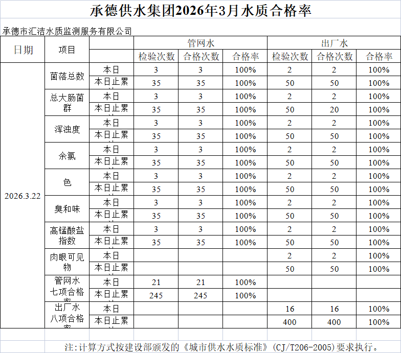 承德供水集團(tuán)2026年3月22日水質(zhì)合格率